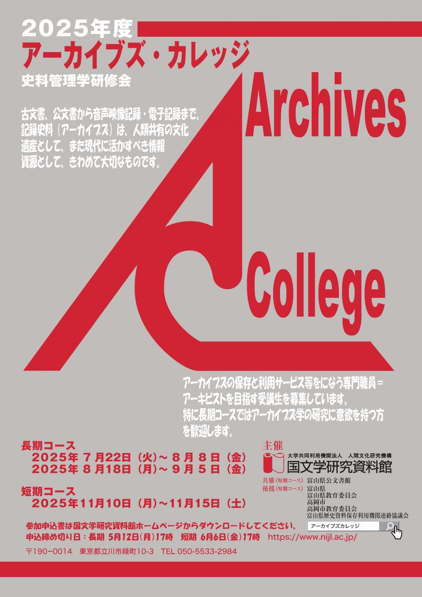 - E-mailの件名は「 【所属】氏名2025アーカイブズ・カレッジ申込(長期/短期)」としてください。 例)【国文研】国文 太郎 2025アーカイブズ・カレッジ申込(短期)