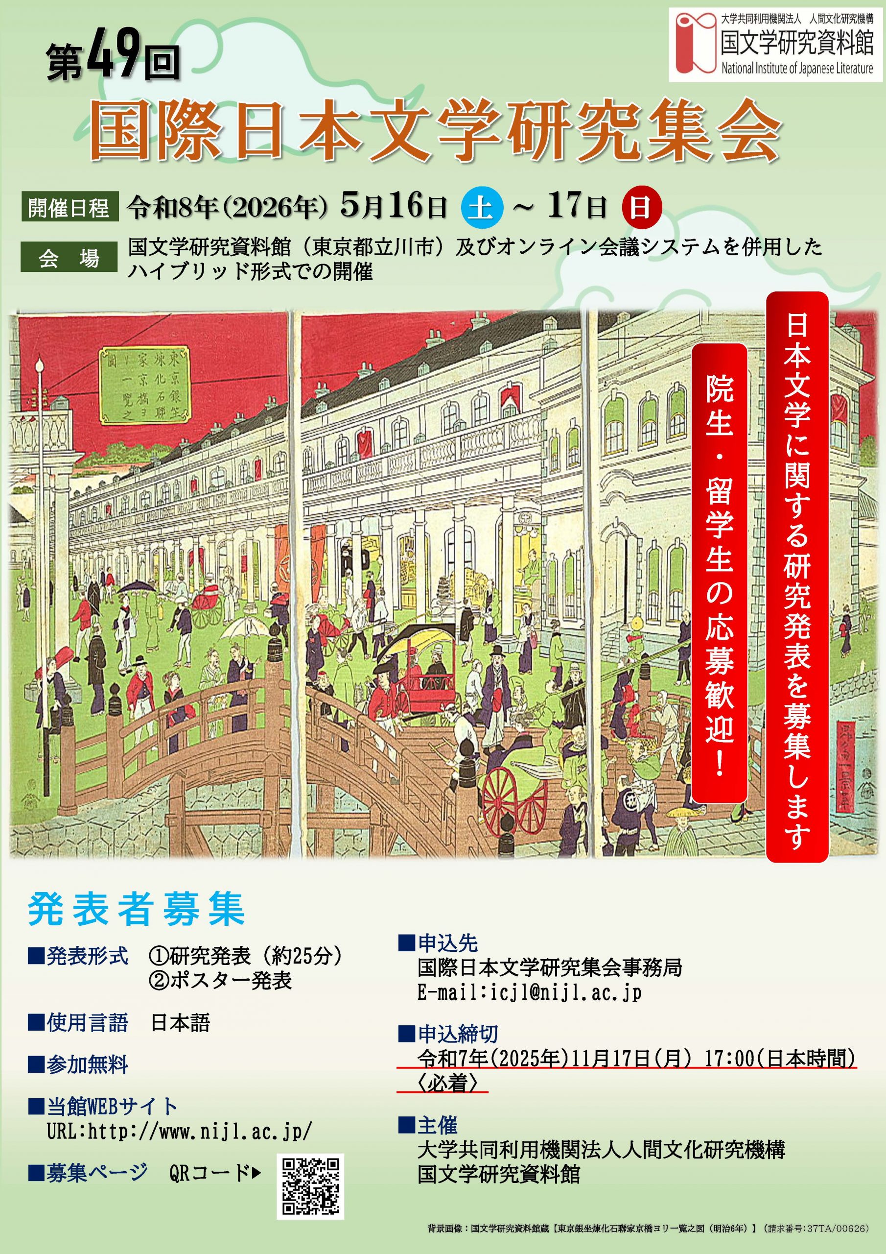 第49回国際⽇本⽂学研究集会では、研究発表者、ポスター発表者(旧インフォメーション・セッション)を募集しています。