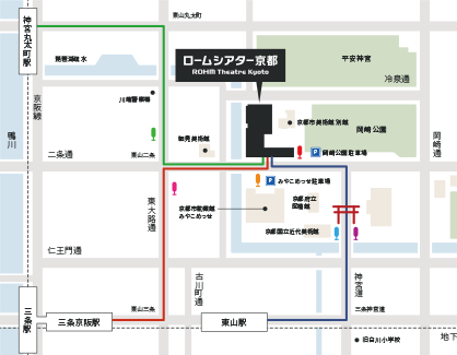 ■ 市バス32・46系統、京都岡崎ループ「岡崎公園 ロームシアター京都・みやこめっせ前」下車すぐ