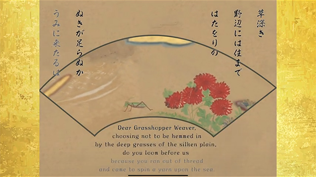 「扇の草紙」は、扇に描かれた「絵画」と、その周囲に書かれた「和歌」を一緒に読み解いていく作品群のことです。屏風や絵巻に整えられた作品の元、古の人々は絵画から和歌を言い当てたるなどの遊戯に興じたと言われています。今回お披露目する「扇の草紙」翻訳コンテンツには、国文学研究資料館が所蔵する屏風「扇の草紙」と、絵巻「阿不幾集」(室町時代成立、国文学研究資料館貴重書)の高精細画像と、書かれている和歌の原文、現代語訳、そして翻訳家ピーター マクミラン氏による和歌の英訳が搭載されています。マクミラン氏は、翻訳の過程で、英訳に苦労した点、工夫した点にこそ、日本文化の特質」を見出すことができる、と語られます。本コンテンツは、氏が感じた日本の自然美や、日本文化の魅力を、アニメーション技術や、音響効果を用いて解説することで、現代に生きる日本人のみならず、訪日外国人にとっても、日本の伝統芸能や歴史的建造物での文化体験を行う前に、容易に日本文化を学ぶことができる絶好の教材となっています。ロバート キャンベル氏とのトークセッションと合わせ、お楽しみいただけますと幸いです。
