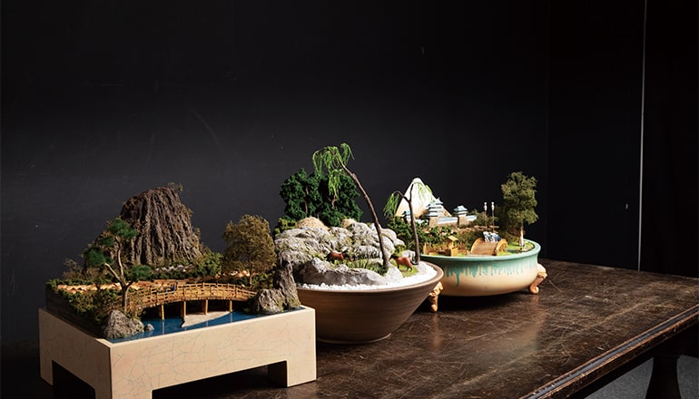 東海道五十三次を鉢植に見立てた江戸時代の絵本をジオラマで表現。